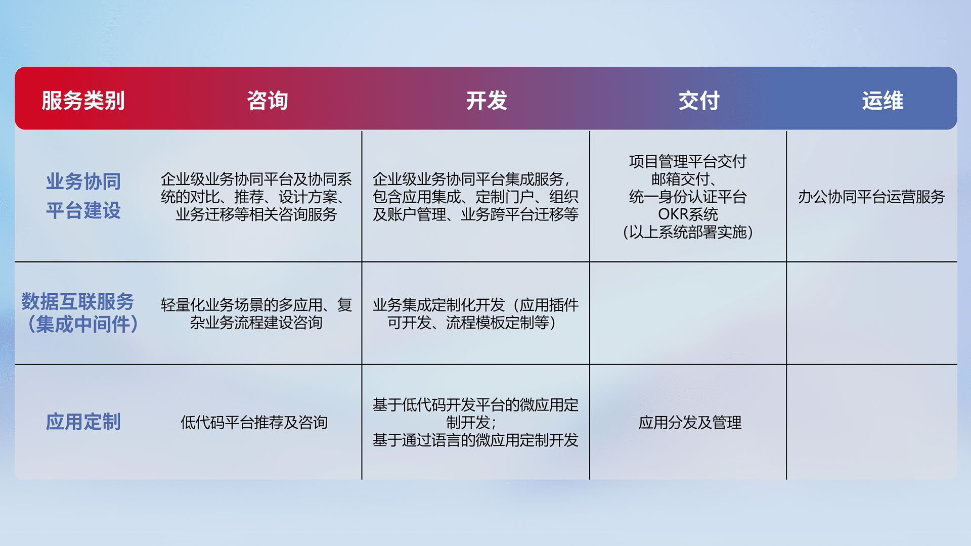 针对钉钉、、、企微、、、IDaas等平台级产品提供产品的规划、、、方案、、、交付、、、、定制化开发等服务,,实现如统一协同办公、、智能客户服务、、、混合会议管理、、、、智能数据查询、、、、等业务场景,,实现数字化转型。。。。