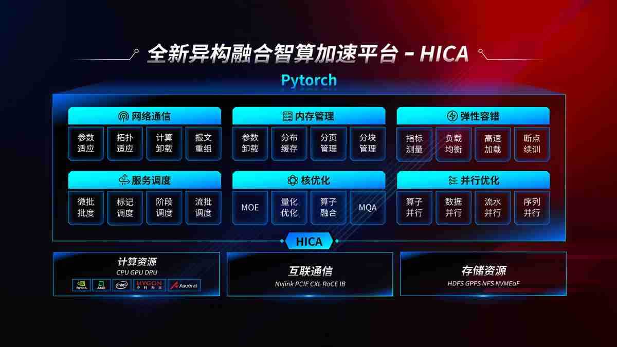 通过自研的服务层、、、中间适配层、、、以及调度编排算法,,,采用数据并行、、模型并行等多种并行方式,,,把并行计算任务进行有效的分解,,使其分别由相应的软件栈和算力资源来承接。。当GPU资源变化,,,HICA可以实时动态调度计算子任务并调整模型拓扑和架构,,以充分聚合各种算力资源。。。