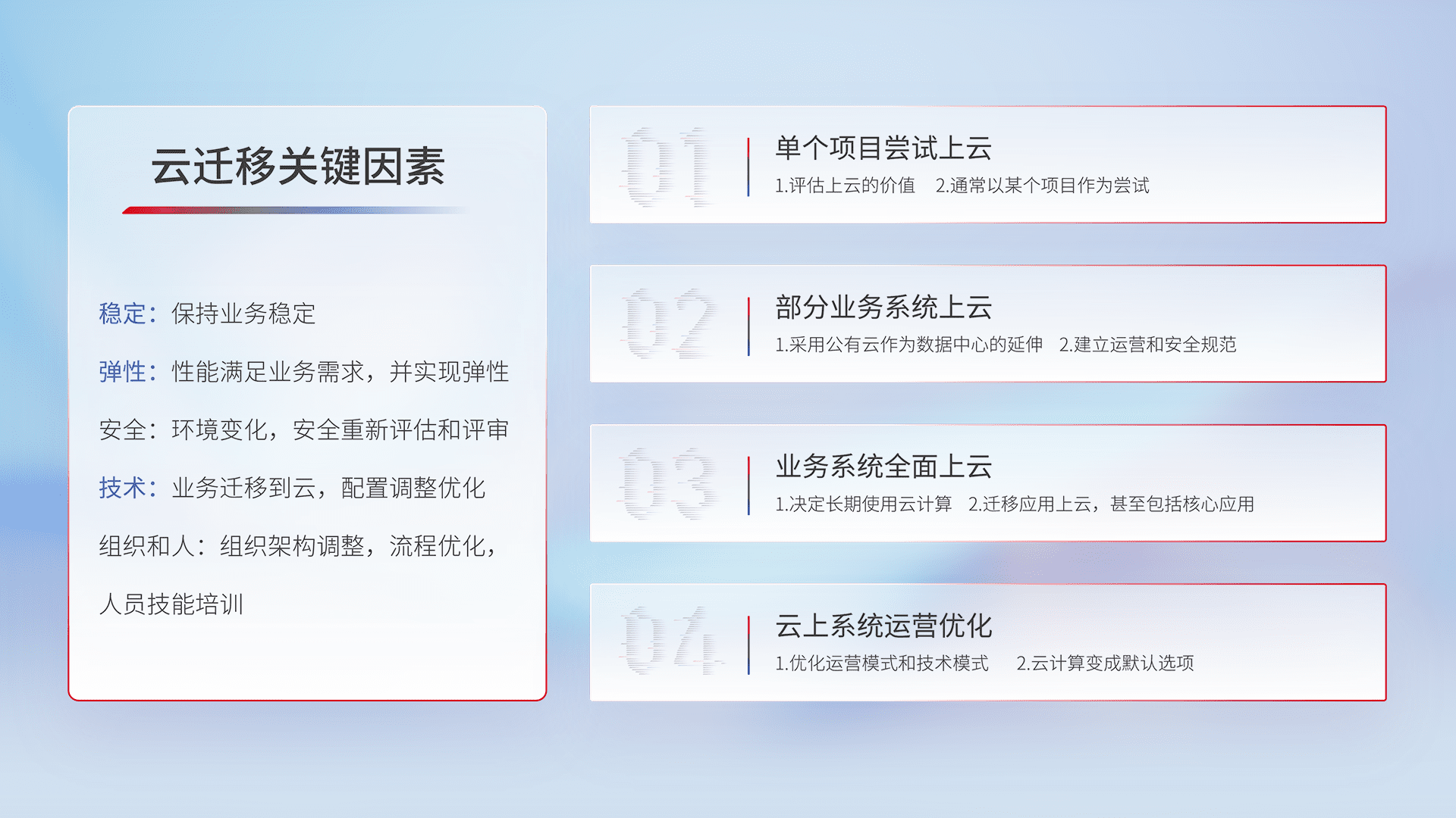 结合实际业务,,,,从规划设计、、云平台选型、、、云原生改造、、数据迁移、、集成交付,,,迁移全过程为客户识别最佳上云路径,,,做好风险识别管理,,,,设计网络架构、、身份权限、、安全审计合规、、、、操作审计、、、、日志审计、、、监控告警策略、、、多站点容灾设计等,,,,对云上基础设施进行整体规划,,,提升IT治理水平,,,,以满足弹性、、高可用、、高性能的需求。。