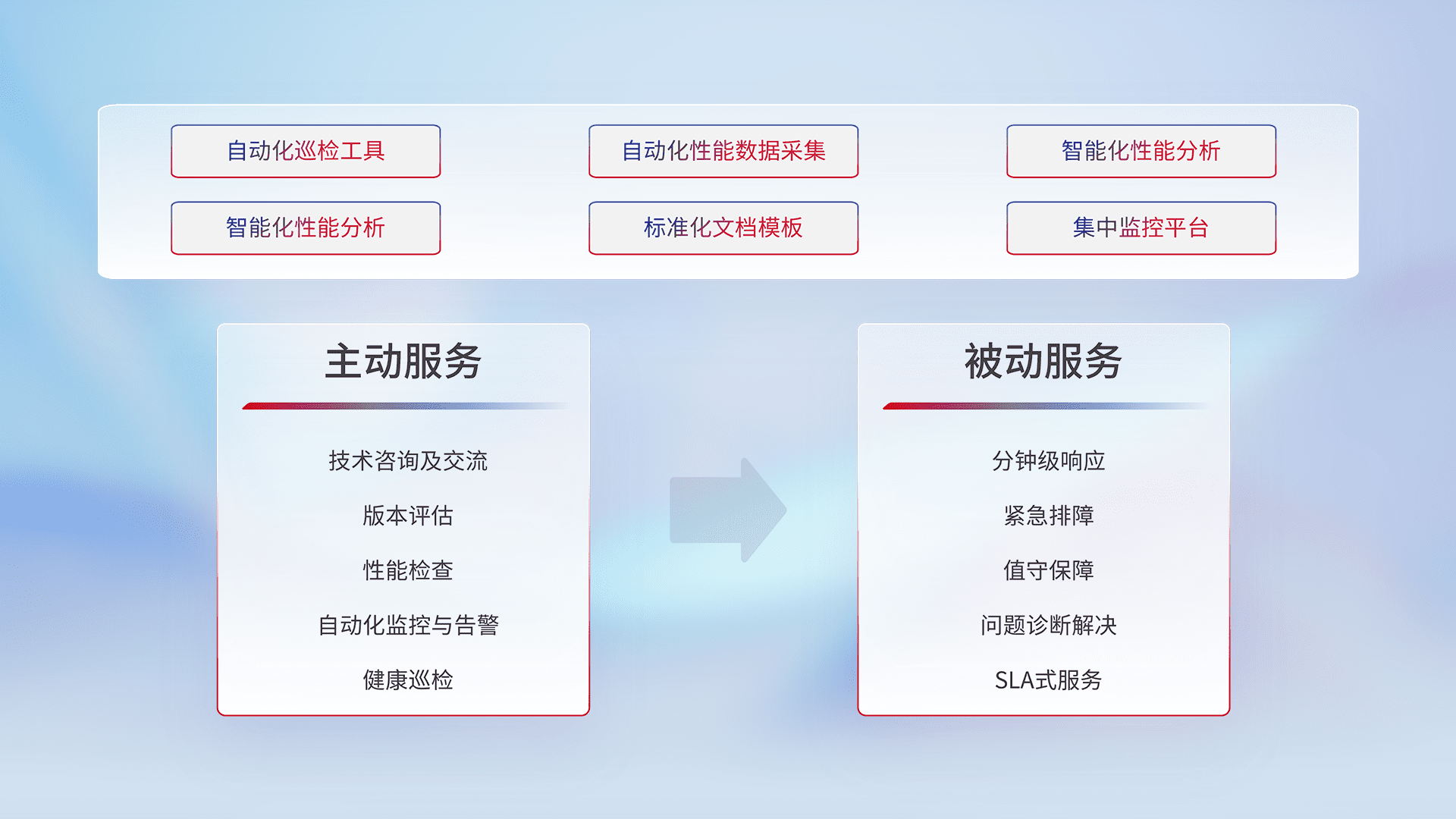 智能化工具和标准化文档,,,,保障服务质量,,,,提供主动服务(包含技术咨询、、版本评估、、性能检查、、、自动化监控与告警、、、、健康巡检)和被动服务包含(分钟级响应、、、紧急排障、、、值守保障、、问题诊断解决、、、、SLA服务)。。。
